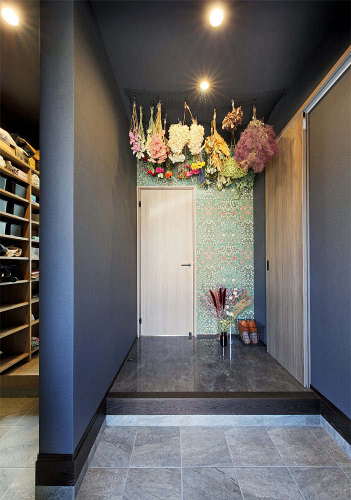 3 玄関ドアを開けるといい匂い。奥さま手作りのドライフラワーが迎えてくれます。 4 リビングから2階を眺めて。TVは壁掛けにしたくて壁を補強。階段下の壁裏にオーディオ機器をすっきり収納。