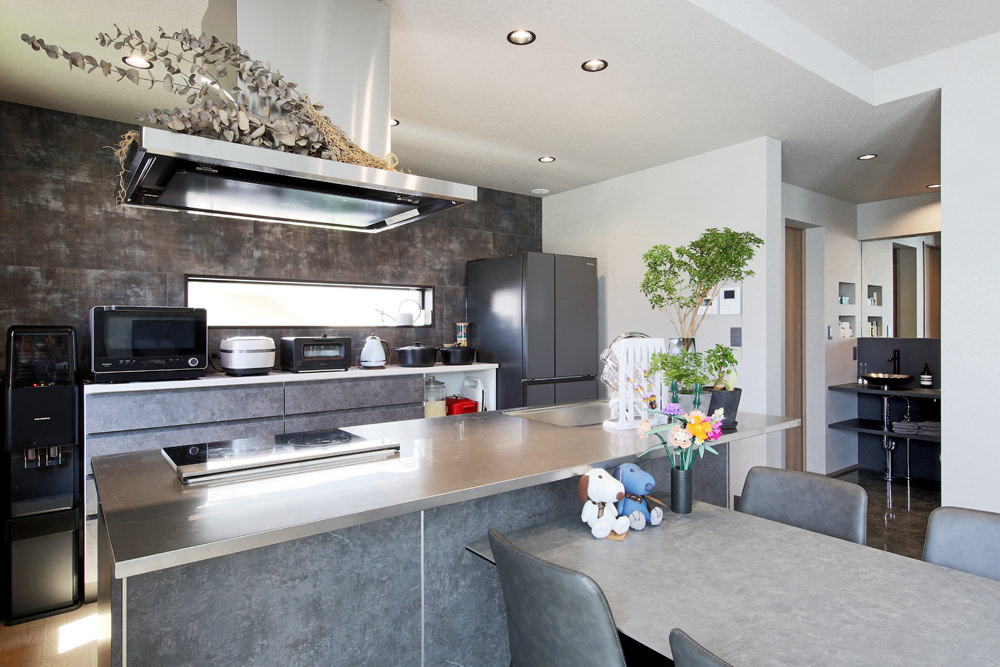 7 モルタル調でコーディネートされたダイニングキッチン。右サイドには洗面コーナーも見える。