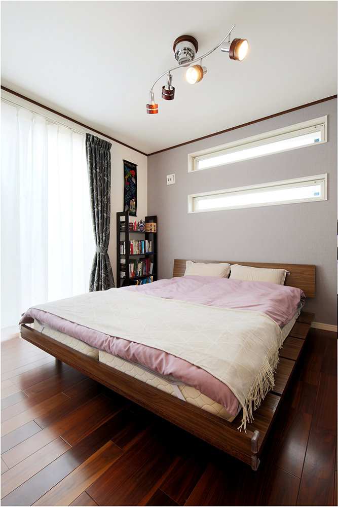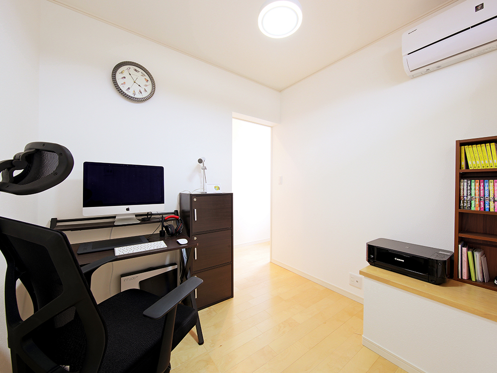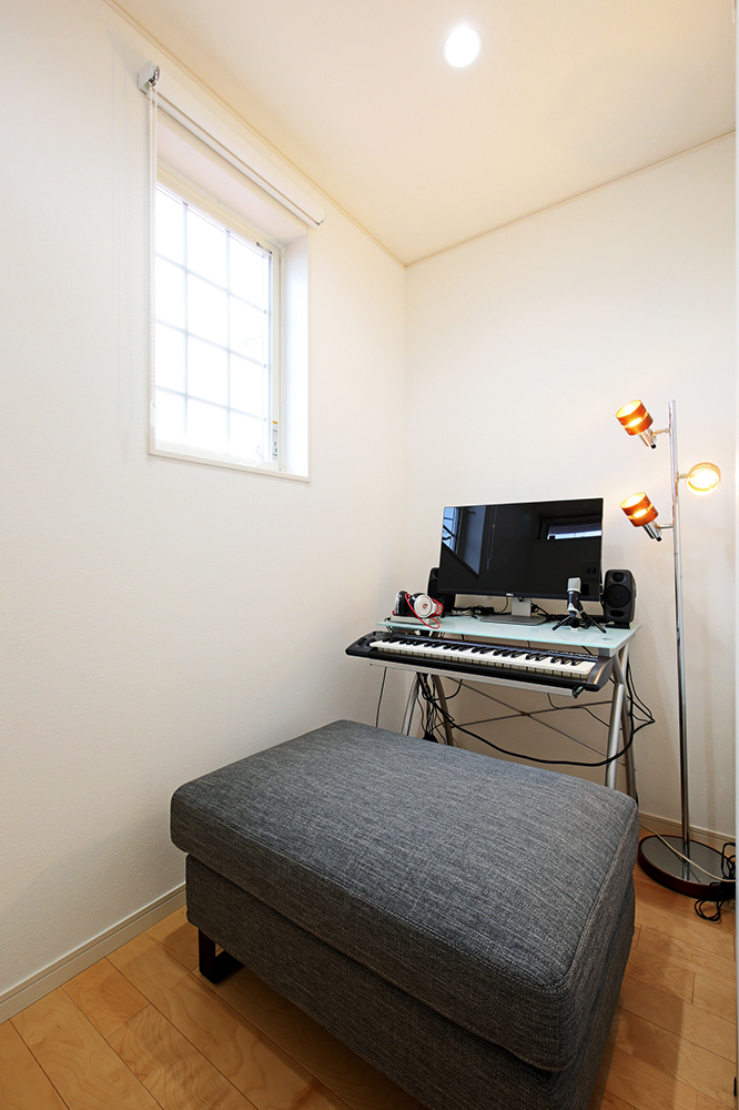 8 機材はクロスと同色のメラニン板で三方を隠したので、リビングにも溶け込んでいます。 9 キーボードやパソコンで音楽を制作するご主人が、趣味に没頭できる大切な空間。 10 将来を考えて1階に配置した主寝室。床はダークブラウンに替えて落ち着いた雰囲気に。 11 仕事のグッズを置いたり、パソコンで趣味の絵を描いたりできる奥様専用スペース。