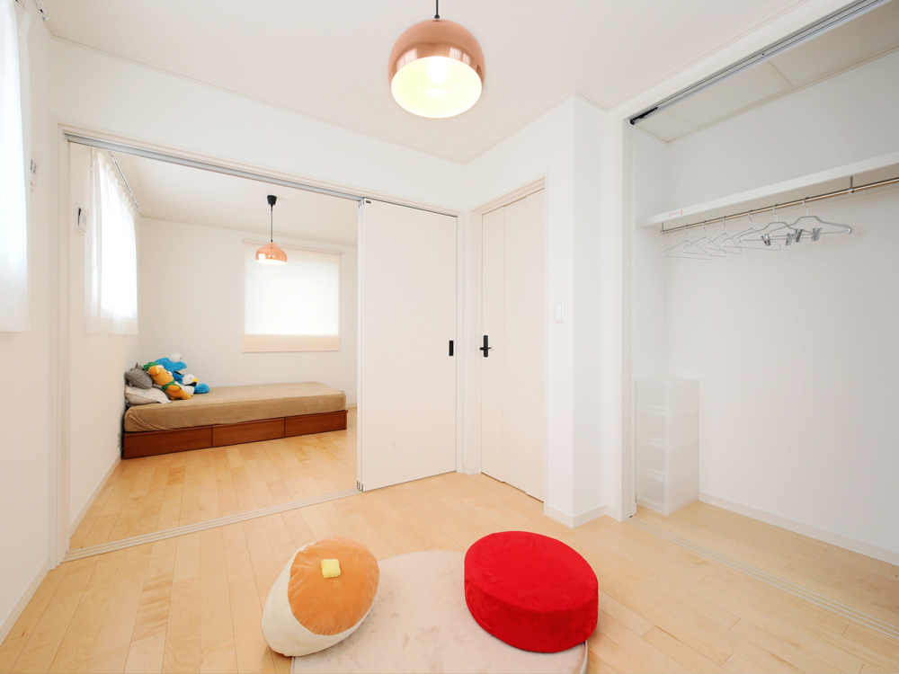 12 脱衣所と洗面台の境に引き戸を設置。忙しい時間に家族がバッティングしない工夫です。 13 取り外せる引き戸で2空間に分けた子ども部屋。成長に合わせて多様な使い方ができます。 14 通常の約2倍の窓を用いることで、テラスや庭がまるでリビングの一部に感じられます