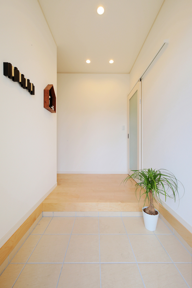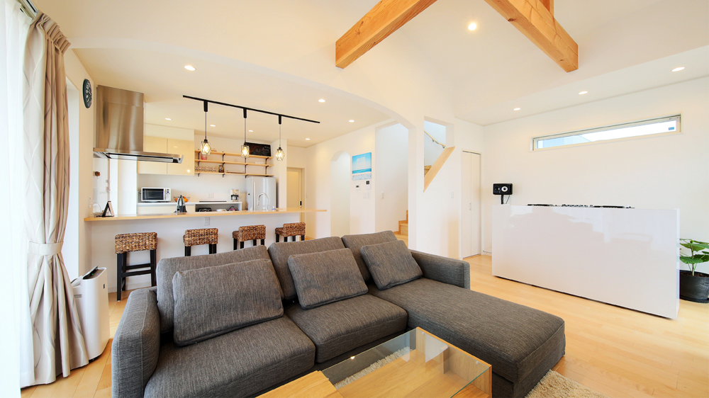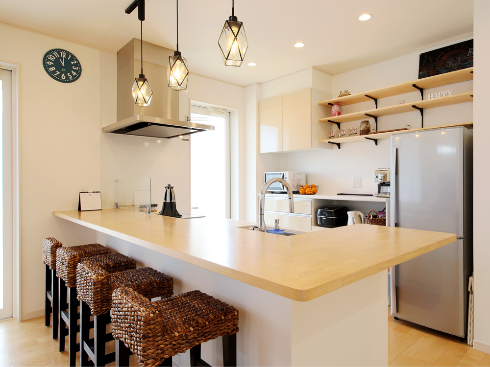 3 引き戸でシューズクローゼットと分けているため、すっきり広々とした玄関 4 ミキサーやジューサーがセットされた本格的なDJカウンターでクラブサウンドを演出。 5 リビングとダイニングとの境にはアーチ型の垂れ壁を用いて柔らかな雰囲気に。 6 ダイニングテーブルを置かずに幅広カウンターを採用。ゆったりした空間になりました。