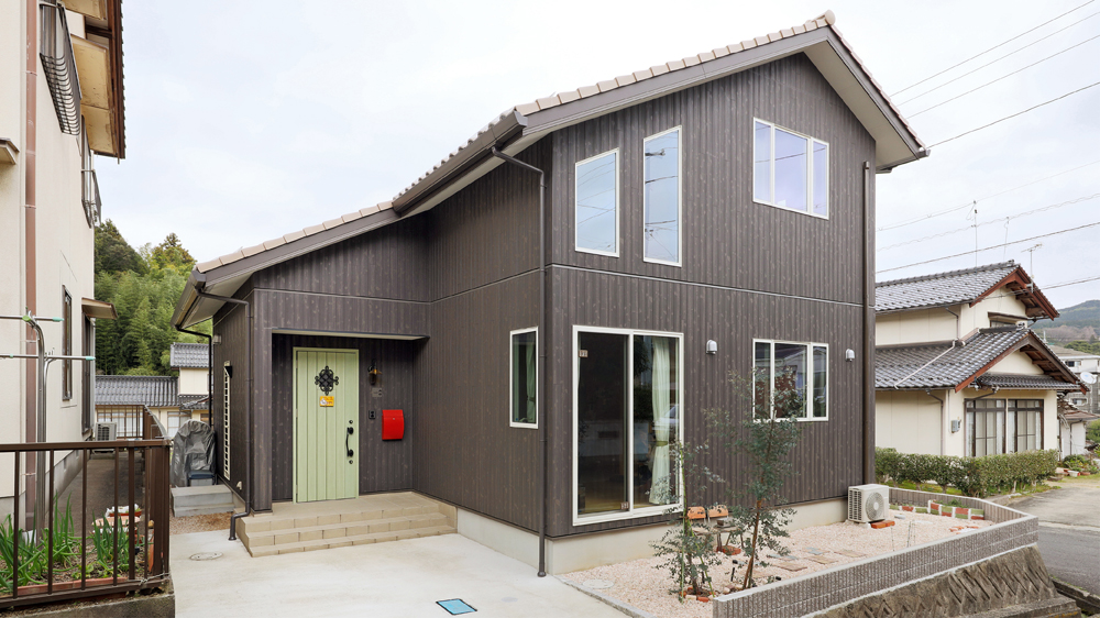 1 ダークブラウンの木目調外壁が、温かいアンティークな雰囲気を醸し出しています。