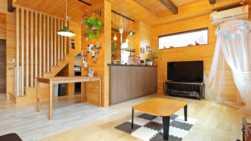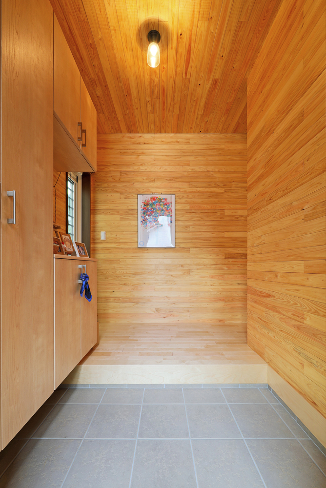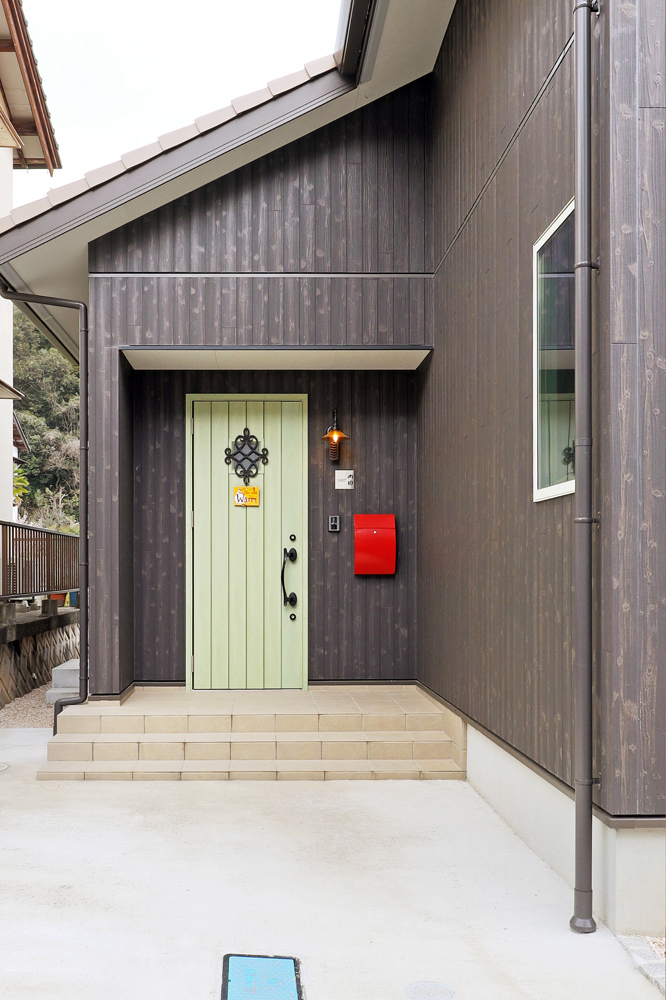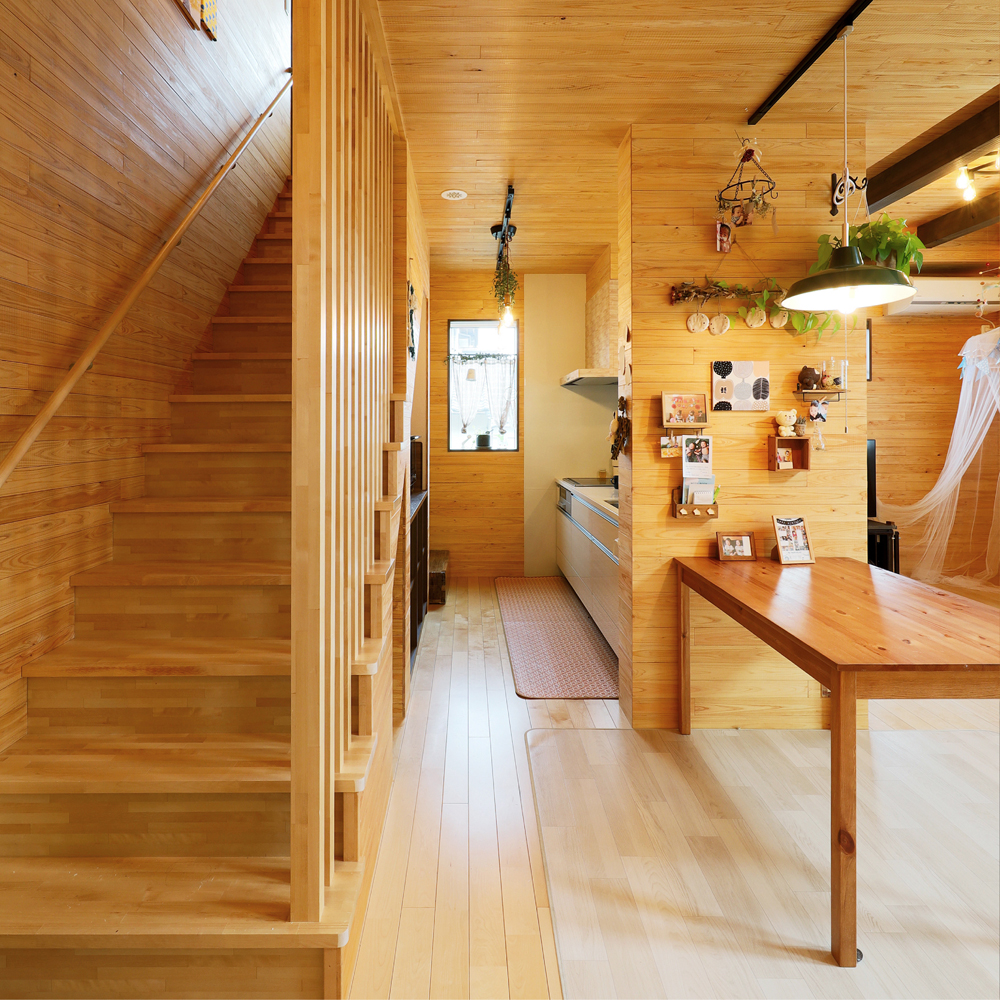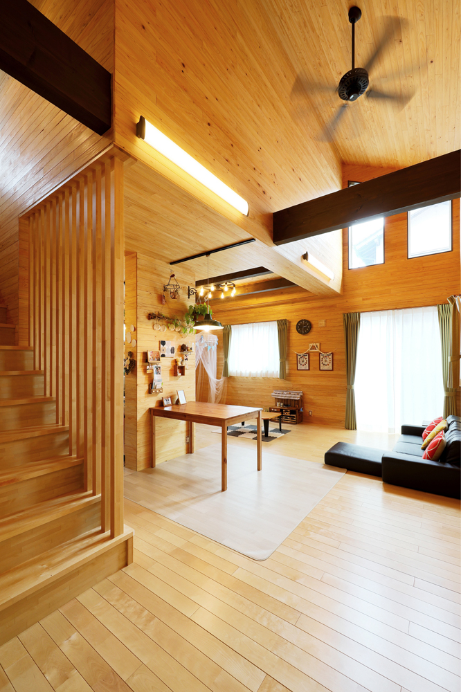 2 日差しを浴びた木の葉を彷彿させる、爽やかなリーフグリーンの玄関扉。 3 玄関ドアを開けると、壁や天井に張りめぐらされた無垢の木に包まれます。 4 一部吹き抜けになったリビングには四方から自然光が射し込み、明るい雰囲気。 5 階段には縦格子を入れることで、リビングがより開放感あふれる空間に。 6 一面木に囲まれたリビングに腰を下ろすと、まるで森に包まれているような感覚に。