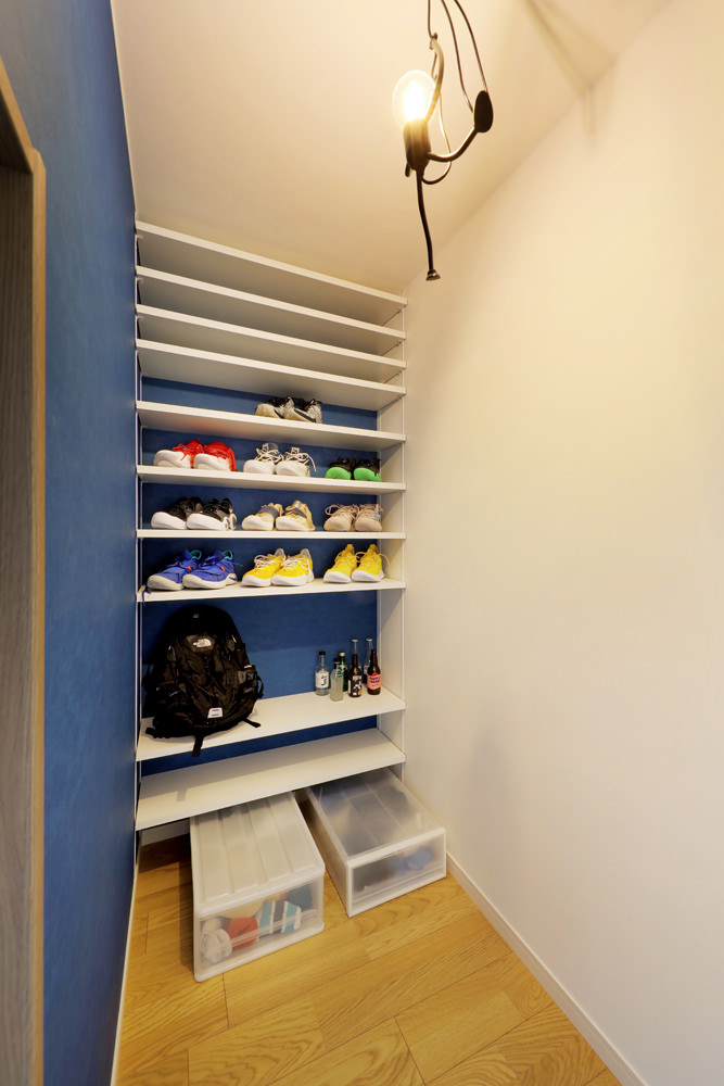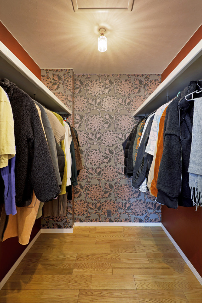 11 ブルーのアクセントクロスが印象的な書斎はご主人の趣味の部屋。 12 大胆なアクセントクロスがクールな雰囲気を漂わせる2階ファミーリークローゼット。