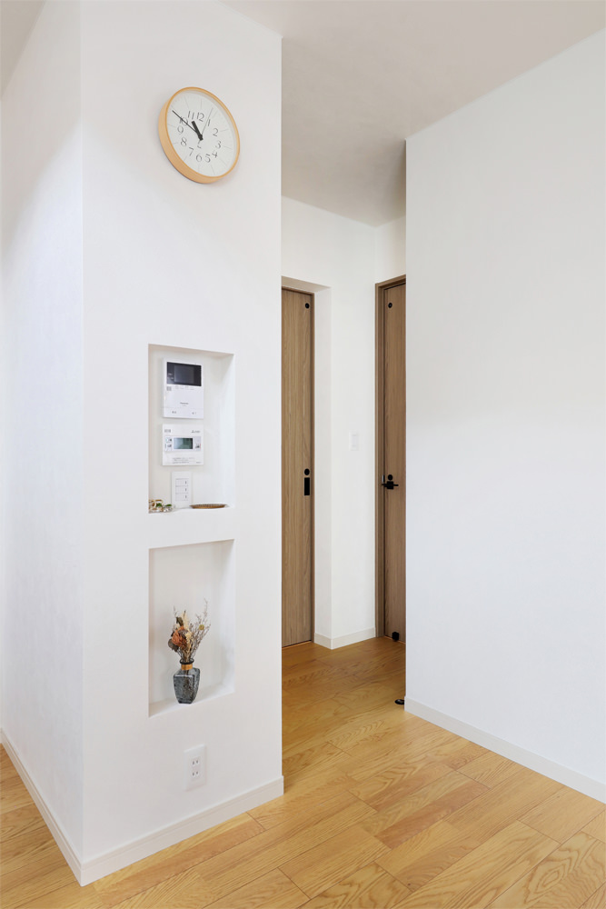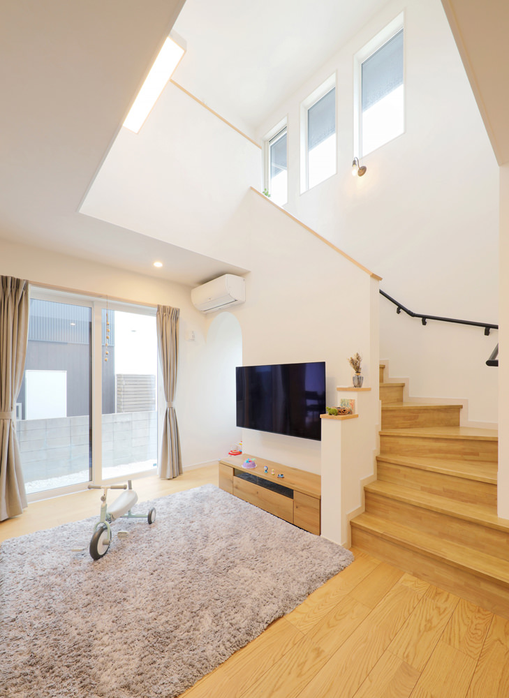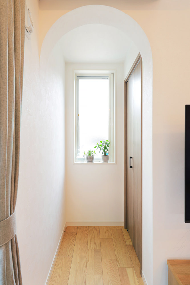 5 アーチ型の垂れ壁はリビングの素敵なアクセントに。 6 玄関からの見通しを遮るために設けられた壁には収納とリモコンニッチを。