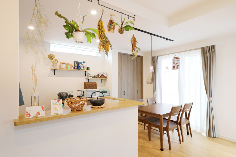 7 キッチンにはハイカウンターを。天井にはハンギングを。壁面にはウォールシェルフを。奥さまコーディネートのダイニングキッチンは絵になる空間。