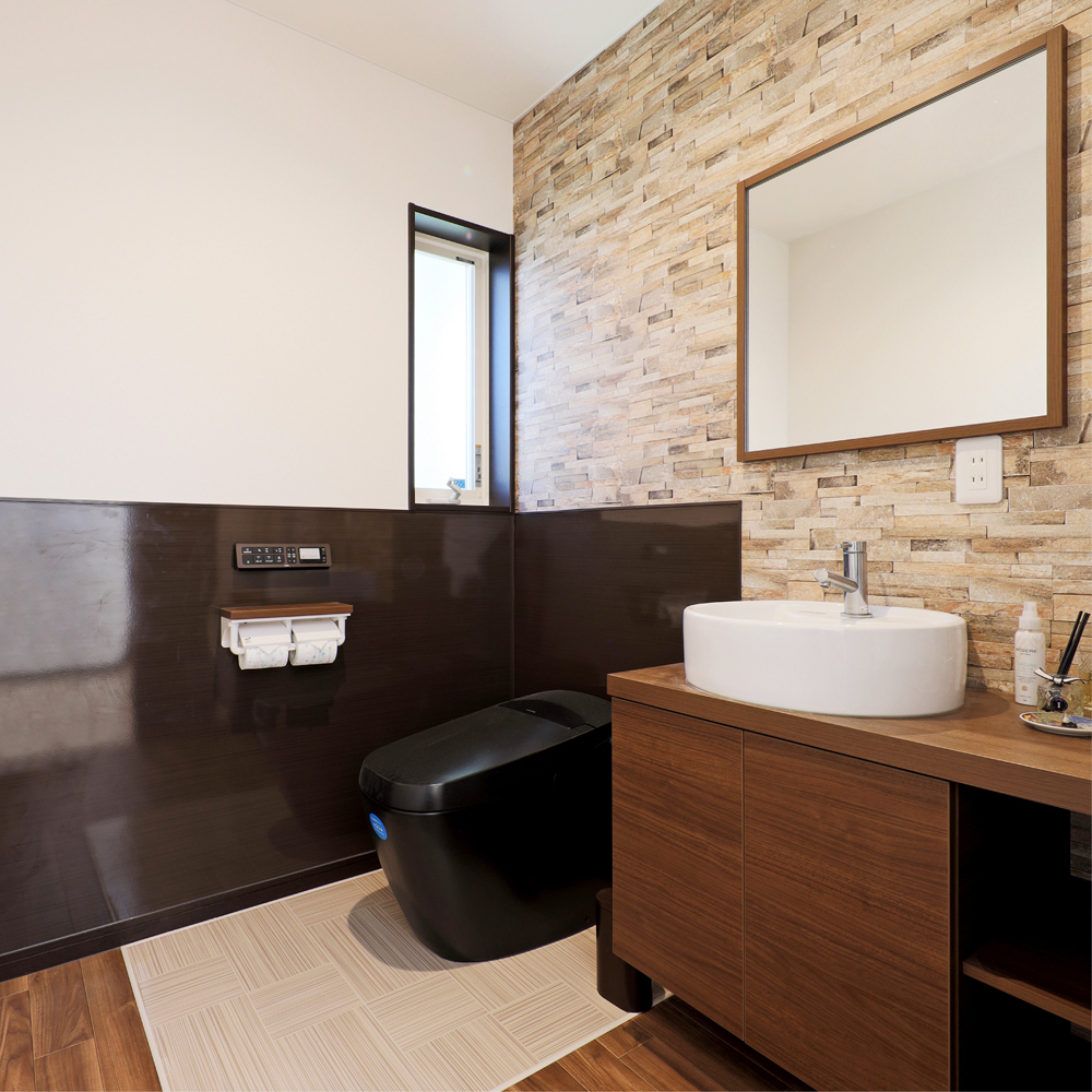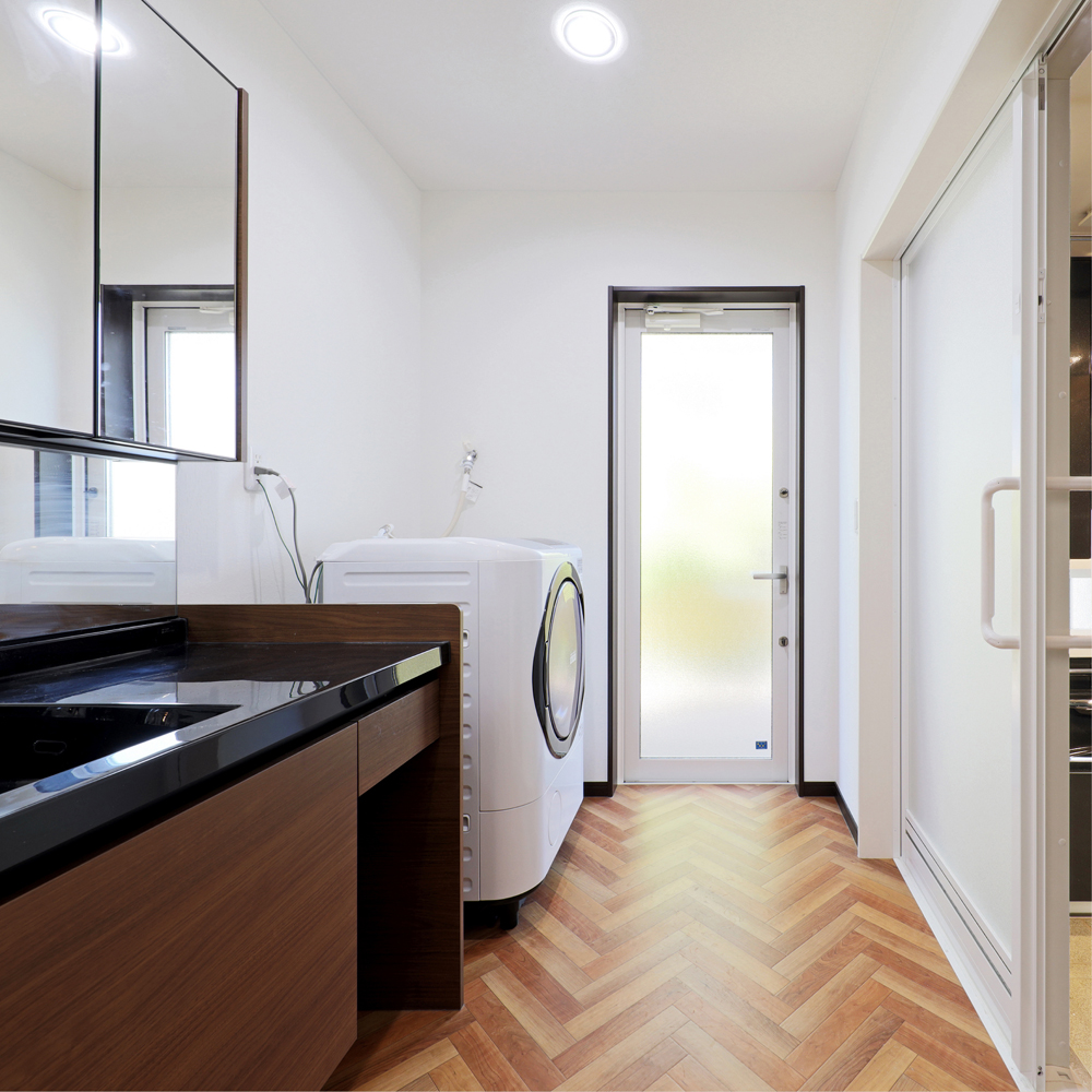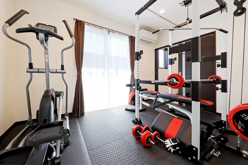 8 本格的なフィットネスマシンを備えたトレーニングルーム。奥には薬草風呂も設置。 9 モダンな洗面脱衣所。洗濯機の奥に勝手口を設け、そのまま外に洗濯物を干せる工夫も。 10 珍しいブラックの便器を採用し、スタイリッシュな印象のトイレ。 11 奥様が化粧品販売とフェイシャルエステを手掛ける美容サロンは、明るい雰囲気に。