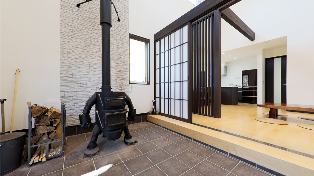 15 存在感たっぷりのロボット型薪ストーブが、玄関土間から家全体を暖めています。