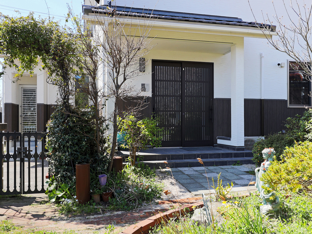 2 亡きお母様が遺した、英国風の庭を生かした玄関前のアプローチ。 3 通りに面した南側には、美容サロンのお客様専用の入り口を設置。