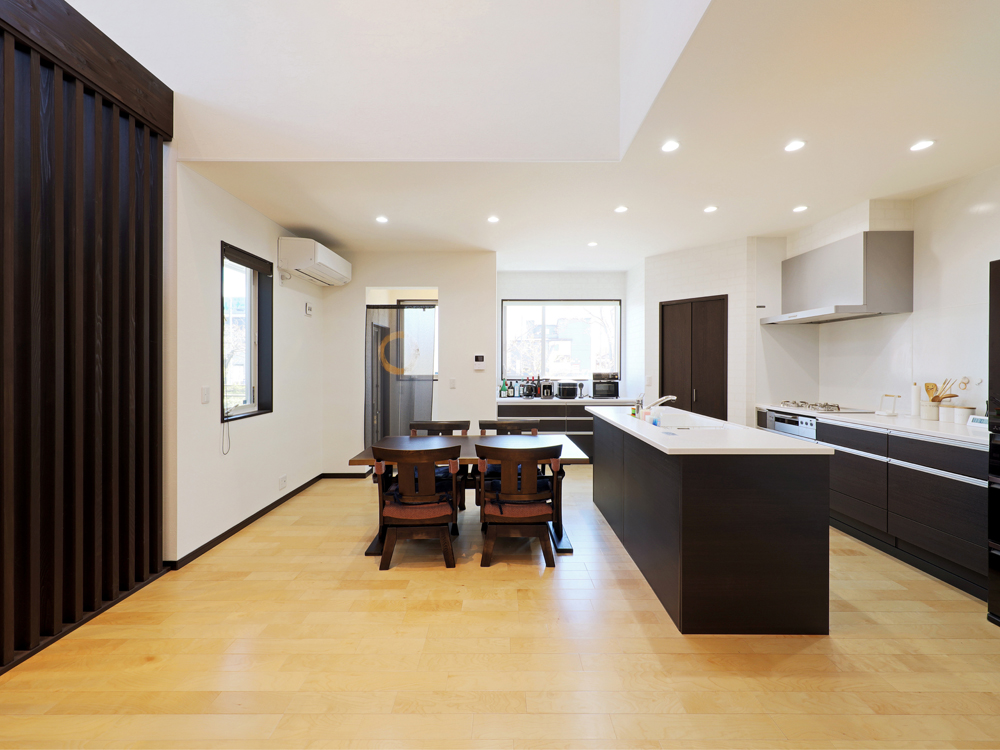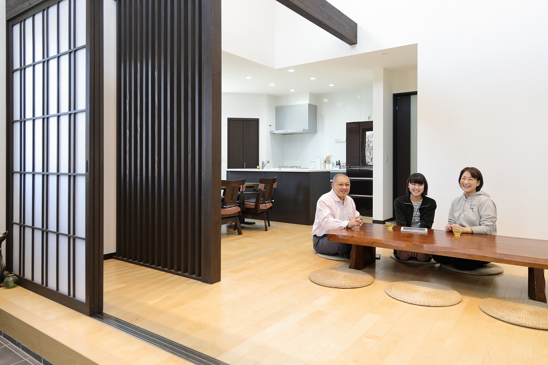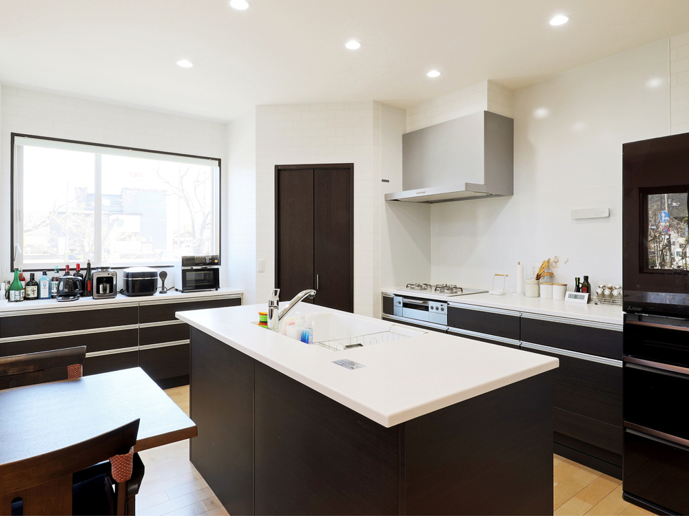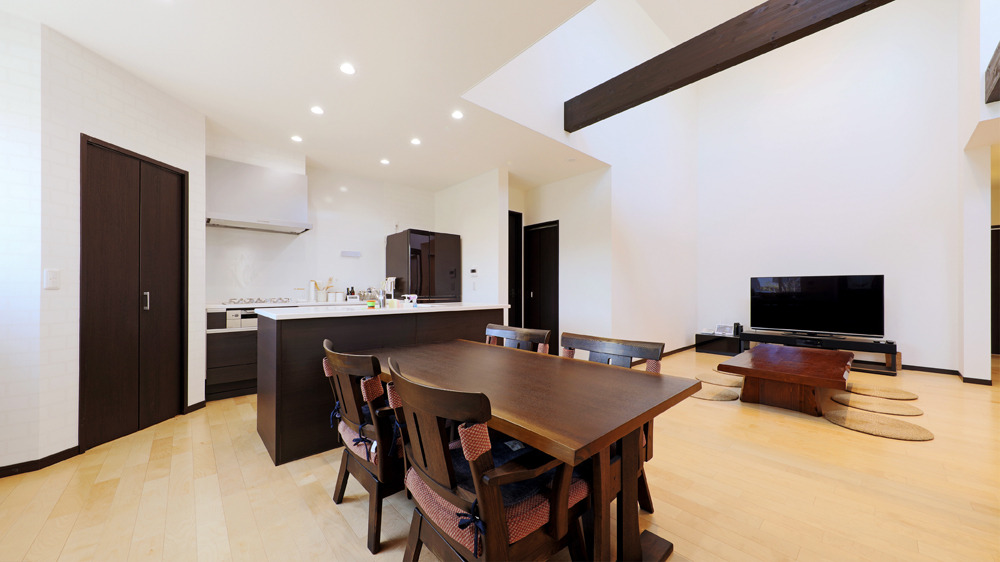 4 一部吹き抜けを採用することで、圧倒的な開放感が生まれた広いLDK。 5 収納スペースを低い位置に集めることで、キッチンも広々とした印象。 6 竈(かまど)を彷彿とさせるキッチン左奥。シックな調理家電を配置してより雰囲気あるしつらえに。