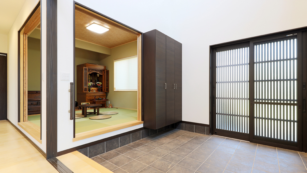 7 お母様を偲ぶお客様が多いため、土間で靴を脱いで、そのまま和室に上がれる設計に。