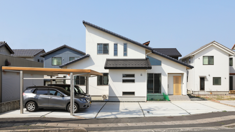 1 耐久性の高いジョリパット塗装仕上げの白い外壁に、銀黒の石州瓦が映えるスタイリッシュなI様邸。