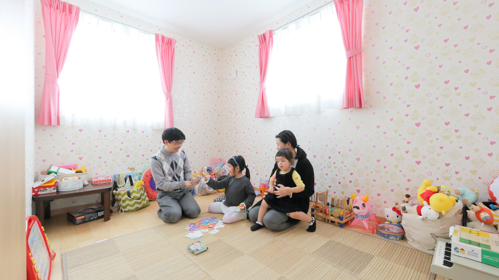 10 2階の可愛い子ども部屋。5歳になったお姉ちゃんがピンク色の壁紙を選んで、同色のカーテンでコーディネイト。