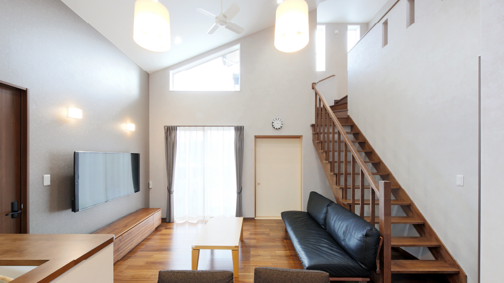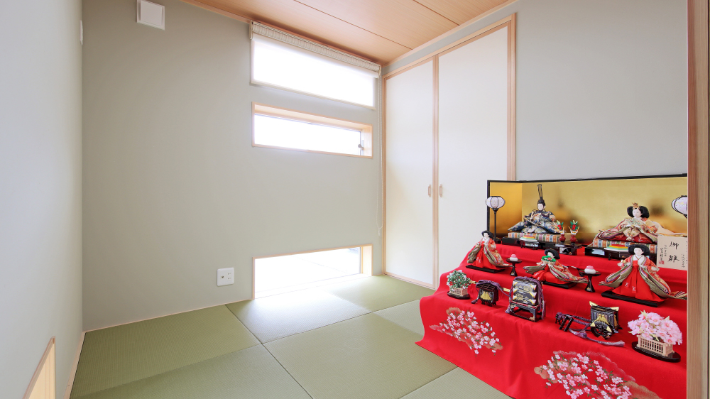 2 開放感に圧倒される吹抜けのリビング。ダイニングキッチンからスケルトン階段、さらに2階廊下まで取り込んだプランが素晴らしい。 3 地窓や横長の2段窓を効果的に配した明るい和室。将来的には、奥さまの趣味を活かして茶室になる予定。