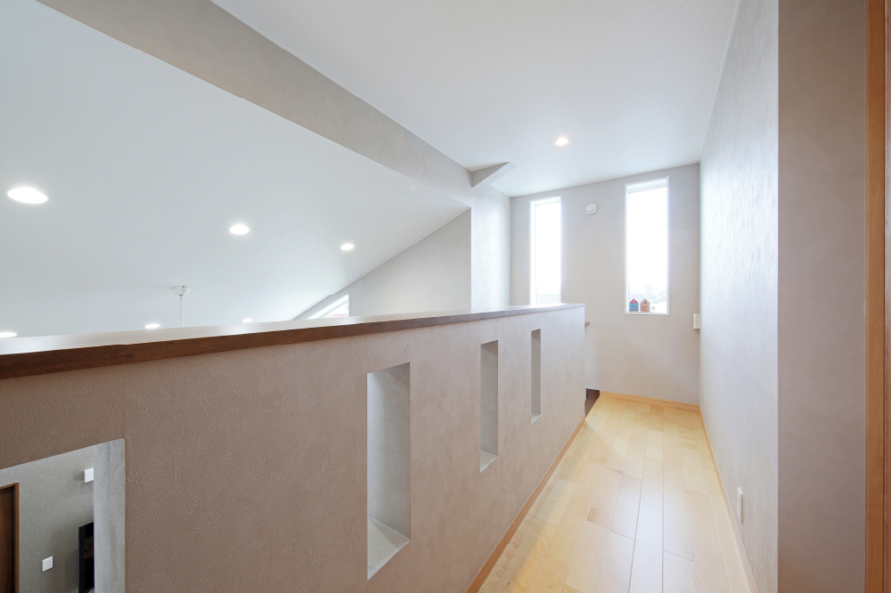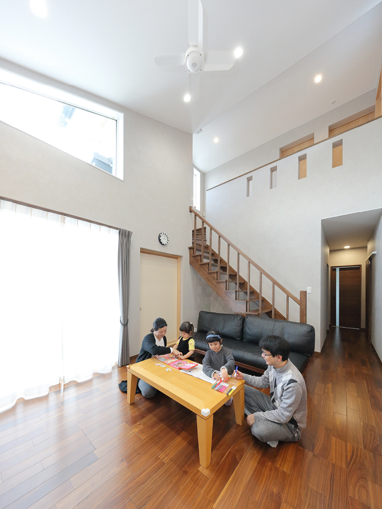 4 吹抜けの大空間もエアコン1台で充分に暖かいリビングでの1シーン。圧迫感を感じさせないスケルトン階段も奥さまのアイデア。 5 キッチンには、収納力を発揮した大容量パントリーも造付け。使い勝手の良いキッチンだからこそ実現できたダイニングの心地良さ。 6 リビングに面した2階廊下の腰壁にスリットを入れたのは、お城好きのご主人のアイデア。城壁に開く狭間のようでもあり、スタイリッシュな印象に。