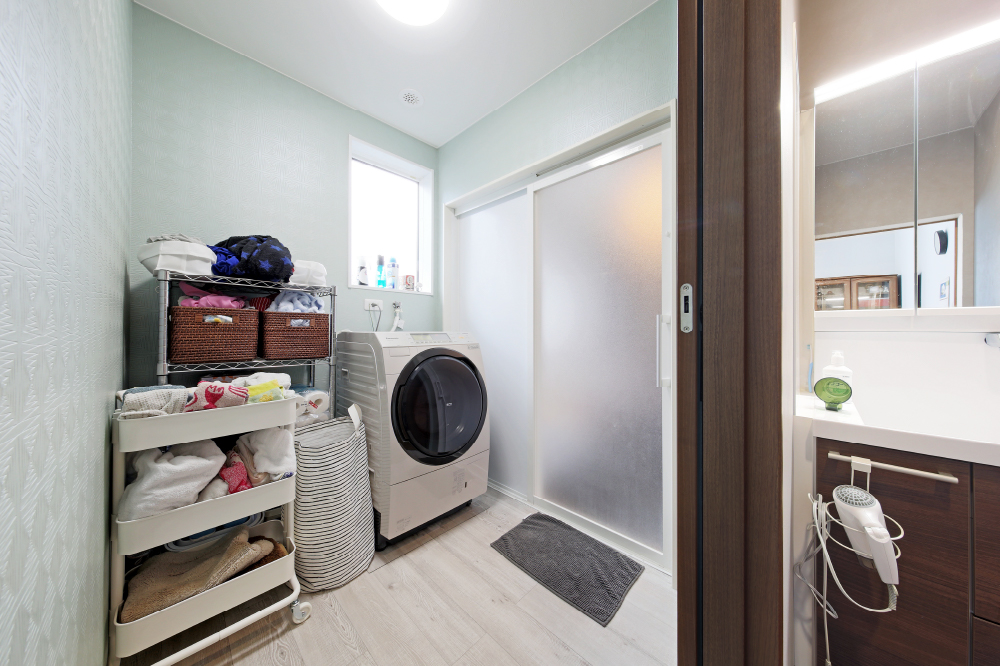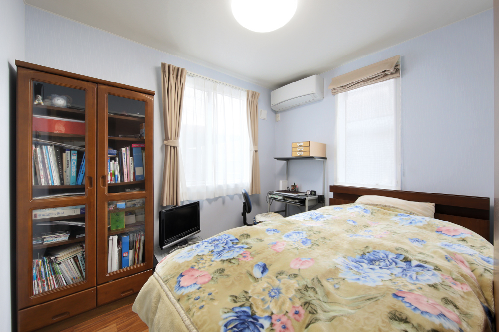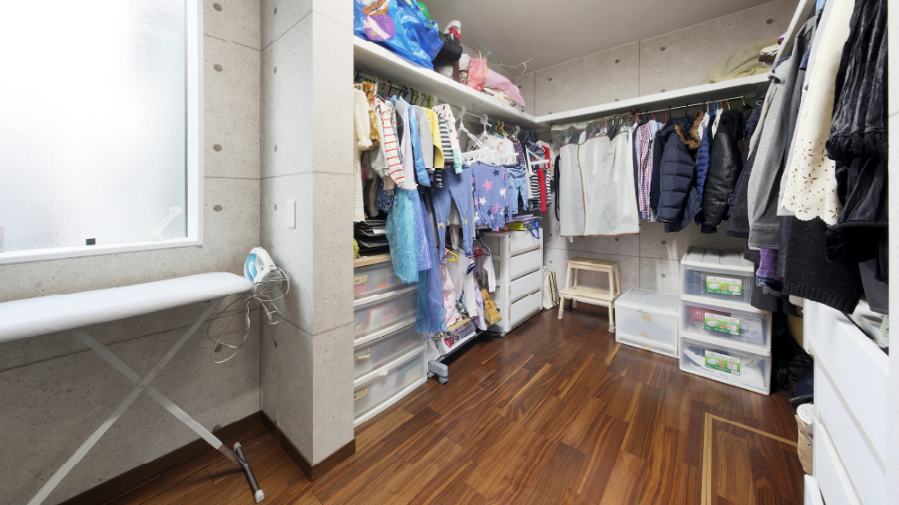 7 ミントグリーンの壁と白木目調の床がおしゃれな脱衣場。「“お風呂とトイレは統一感を考えなくていい”と教えてもらったので遊んでみました」と奥さま。 8 仕事に勉強に集中できる部屋が必要だったことから設けられた書斎兼寝室は、まさにご主人のお城。 9 家族4人分をゆったりと収納できるウォークインクローゼット。アイロンがけから収納までスムーズに行える充実の空間も、奥さまのアイデア。