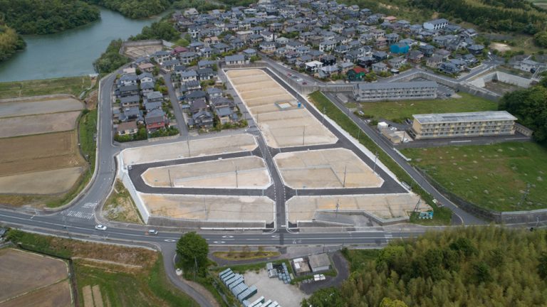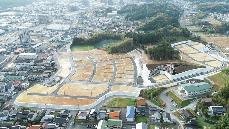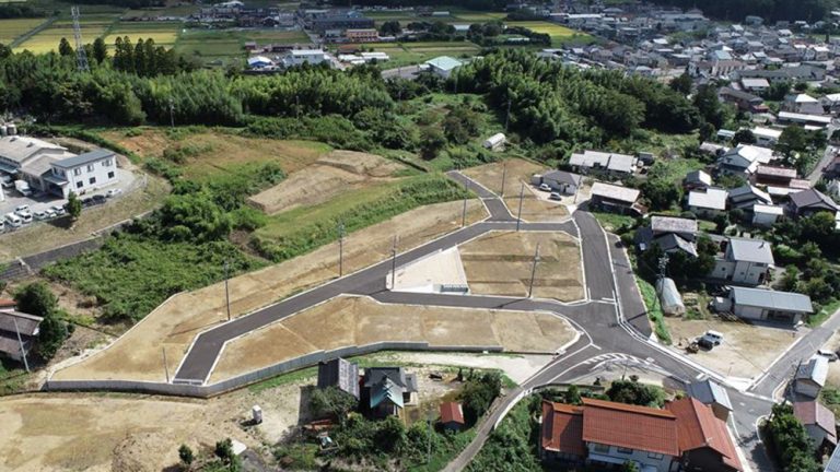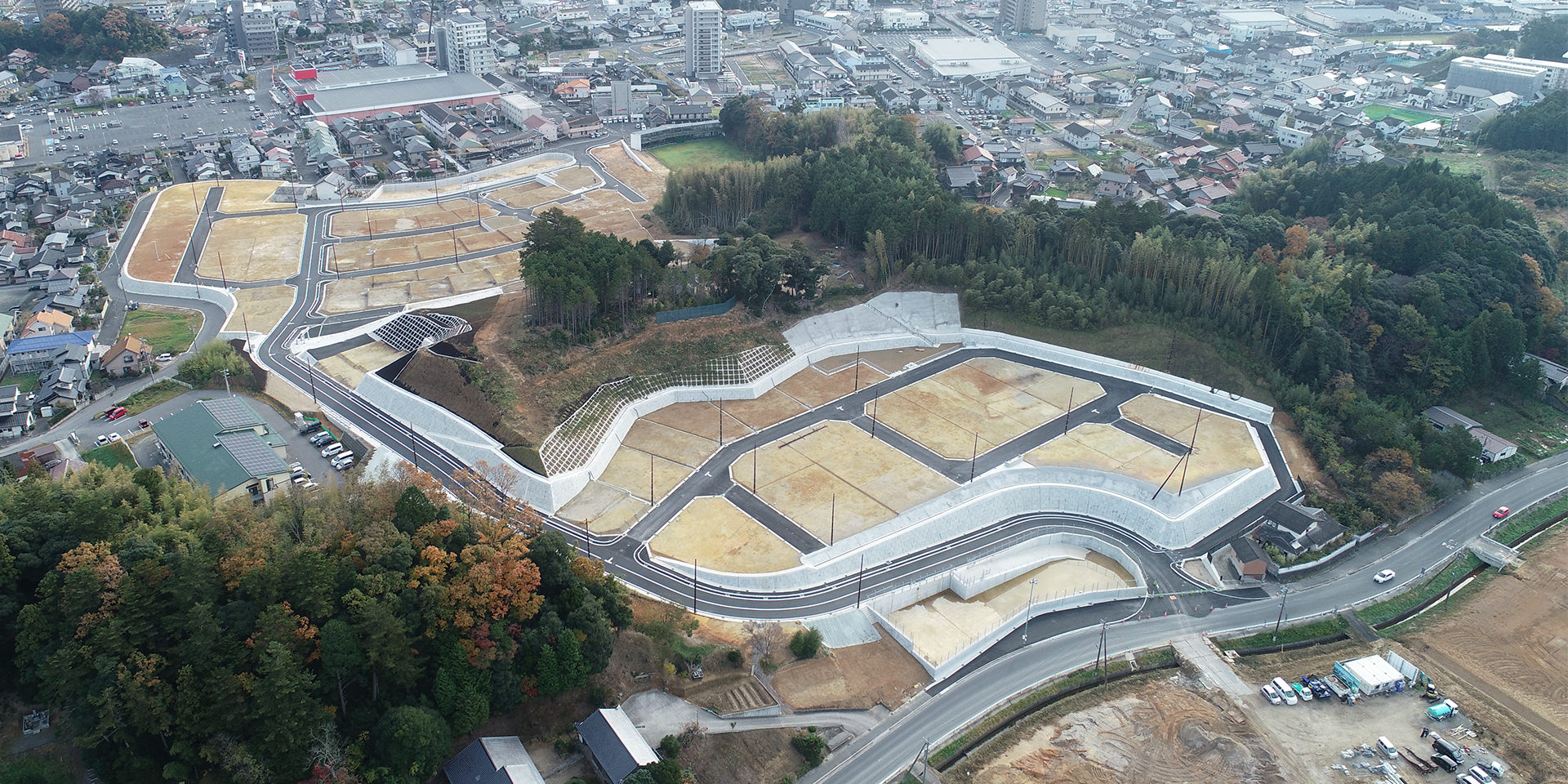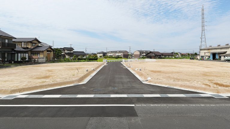 - 平地の100区画大型タウン。団地内道路は6mをとり、団地内各所にゴミ収集庫を設けた快適な団地です。集会所用地・公園も確保された、学校、幼稚園、病院、福祉施設、商業施設など快適な生活環境が充実した新しい街です。