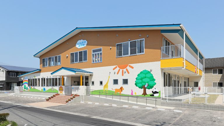 - 0歳児から受け入れ可能な保育園と小学生のお子さんを受け入れできる学童クラブを併設した施設。保育室6部屋に遊戯室と児童クラブ2部屋の他に、厨房やスタッフルーム・ロッカールームも完備。テラスや園庭などもあり、施設前には駐車場や来客用スロープも設けている。