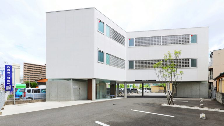 - エントランスや駐車場としての1階、受付・待合・診察室などの医院としての2階を含めた鉄骨3階建て。東西に延びる建物の両端それぞれに階段を設け、スタッフ用とお客様用とに使い分けています。