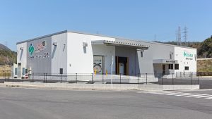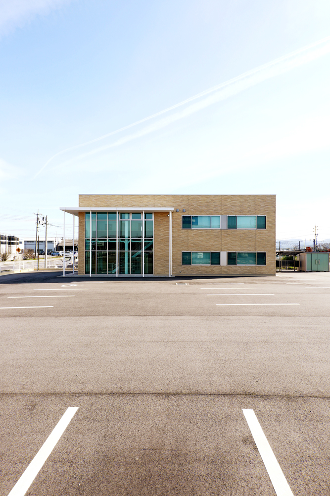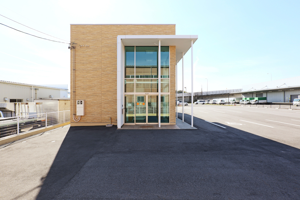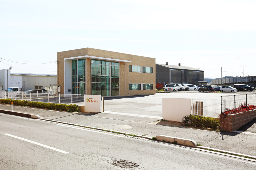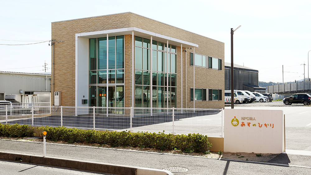 障がいのある方々の就労支援事業所であるNPO法人あすのひかりの事務所。事務室や休憩スペースなどのスタッフルームが確保された鉄骨造2階建て。