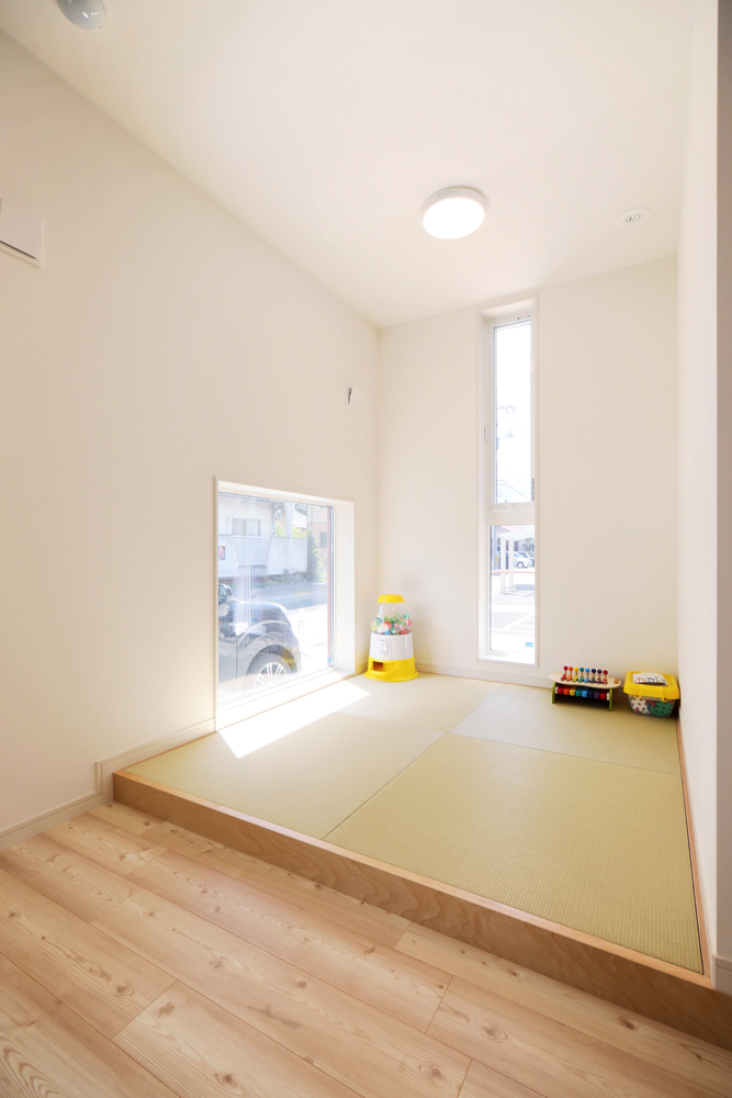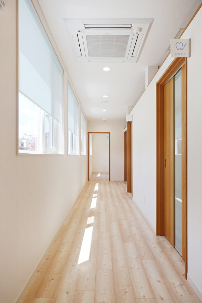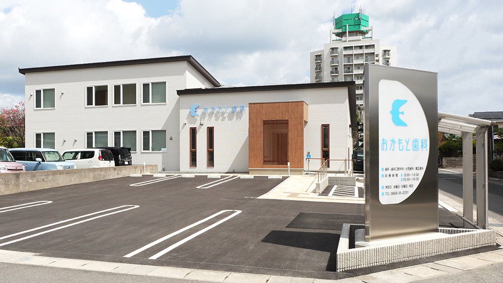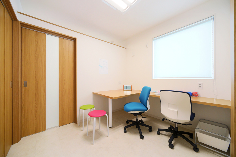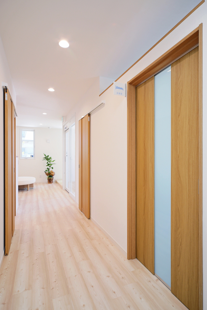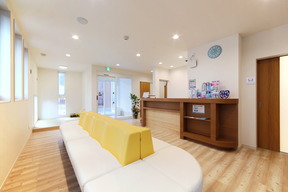 待合室、診察室、処置室、レントゲン室や作業室などのある木造2階建ての歯科診療所棟とアルミ造平屋建てのサイクルポート棟を建築。待合室にはキッズスペース、診察室はほぼ個室のような空間と、スムーズに診察をしやすい・受けやすい環境を整えました。