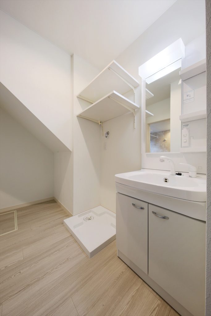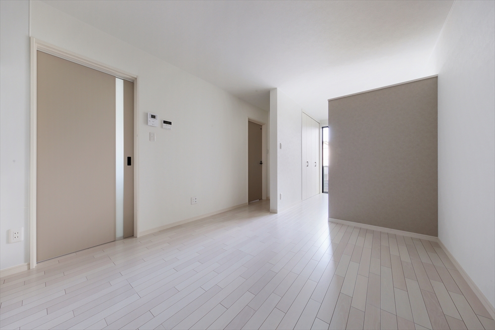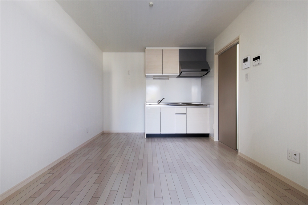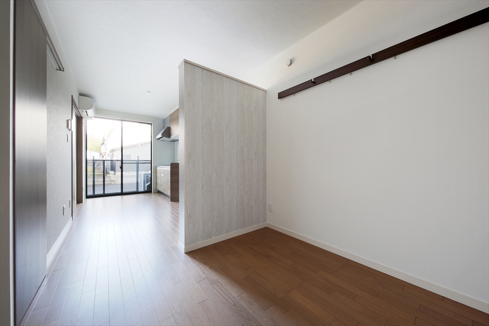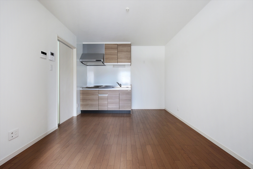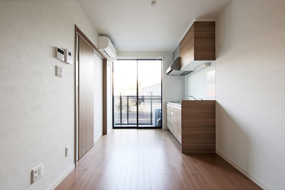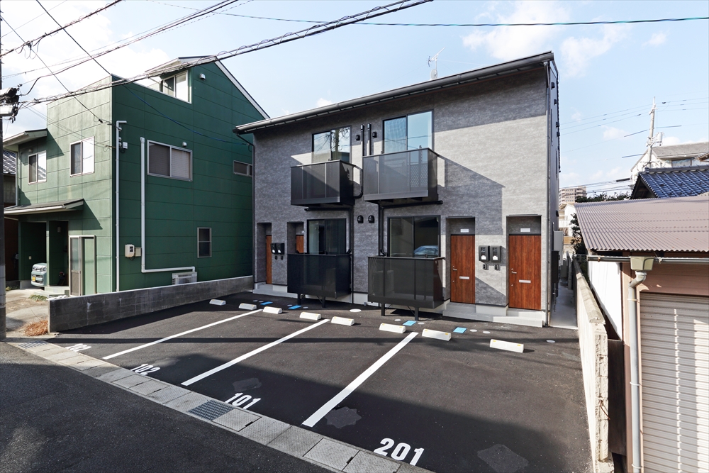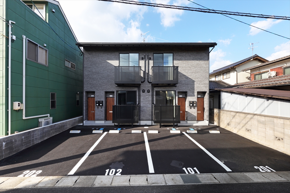 ユニットバス・トイレ別のシステムキッチンも完備した1LDKの賃貸アパートです。洗面脱衣に洗濯機置き場があり、物干し金物付きのバルコニーも設けてあります。東西に入口があり、間取りは東西で同じですが、部屋によってクロスやフローリングが変えてあります。各居室用に駐車場が1台ずつ用意されおり、駐車場には車輪止めが設置されているので安心して駐車ができます。