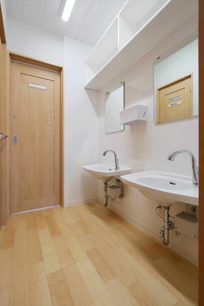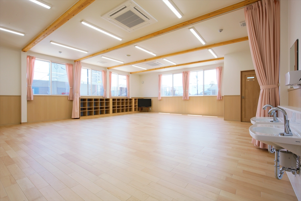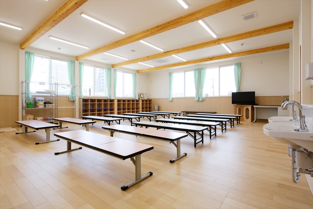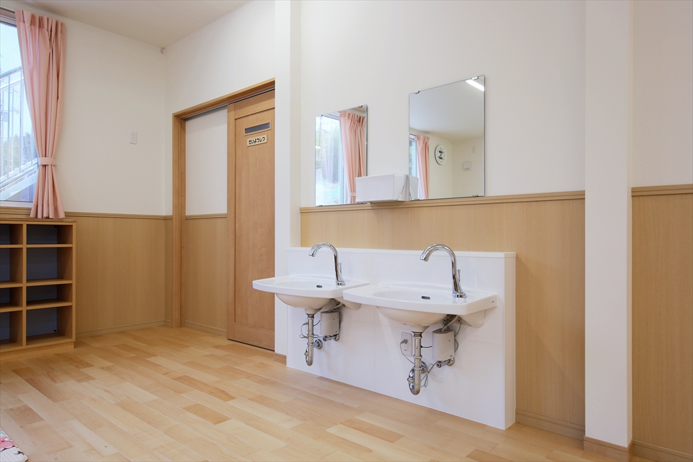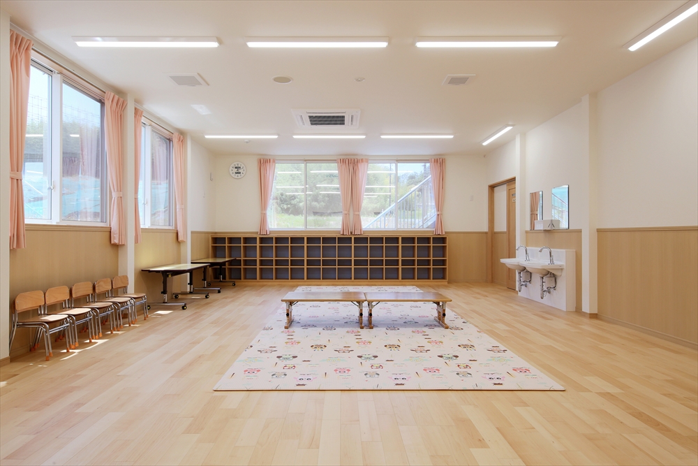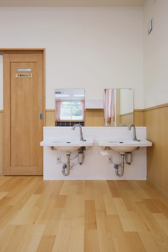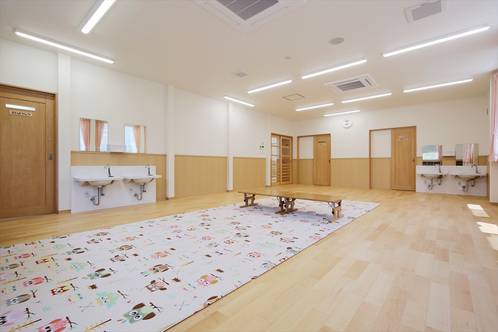 2020年に完成しましたひらぎの保育園にも学童クラブを併設しておりましたが、2号館として別の宅地に新しい学童クラブを新築。子どもを預かる部屋だけなく、スタッフの事務室や相談室を完備。急な体調不良にも対応できる静養室もあり、感染症対策となる手洗い場を部屋内にも設置してある。