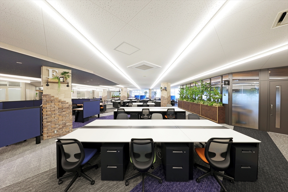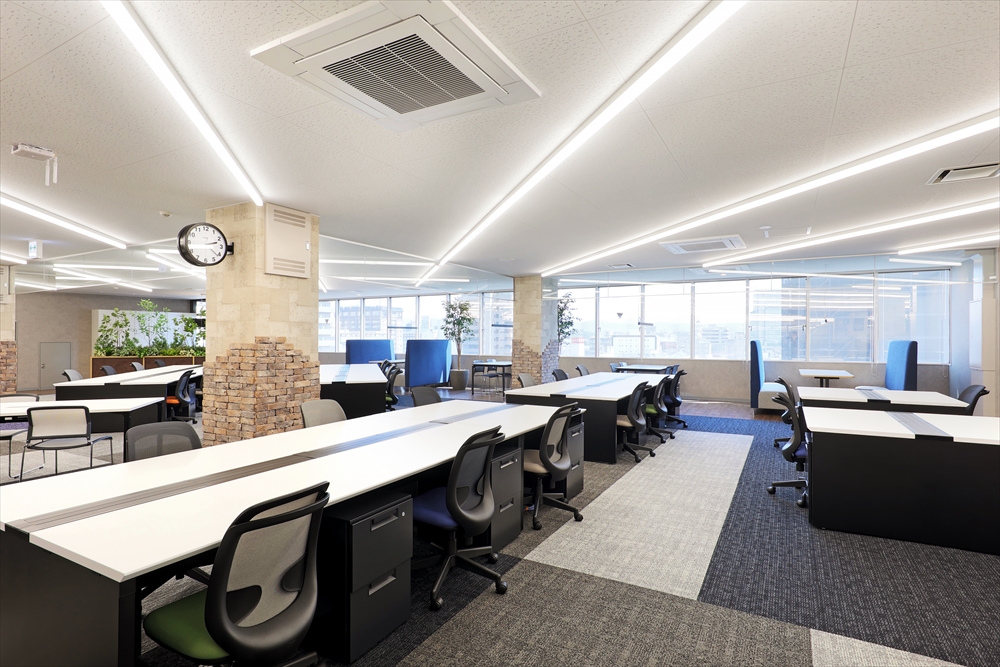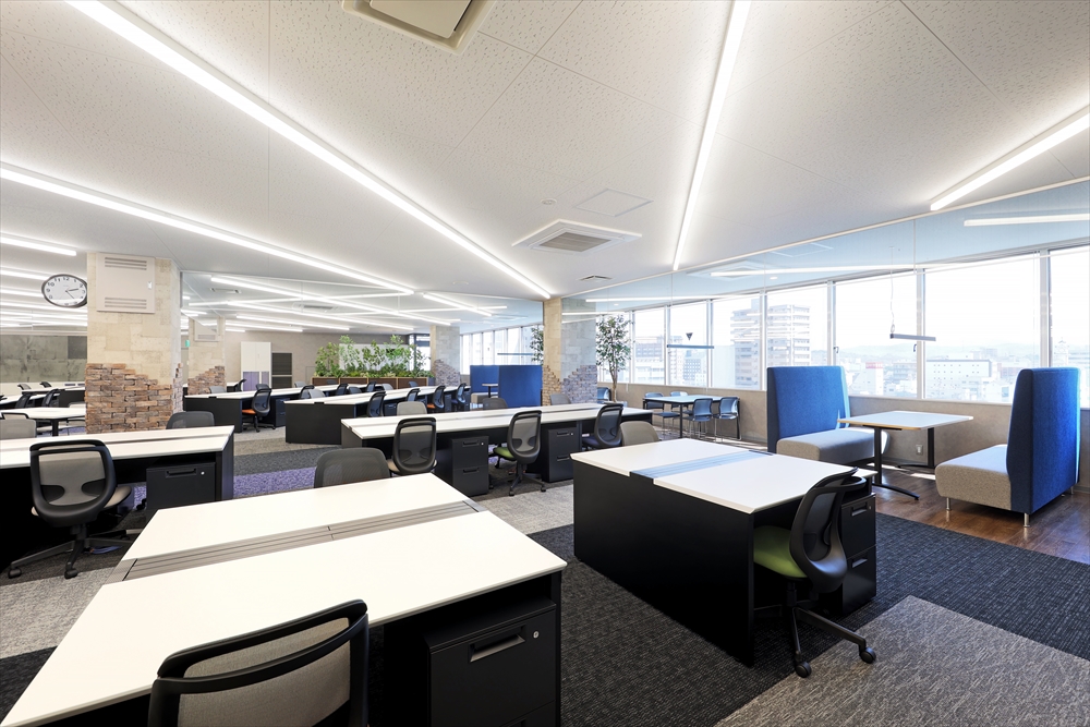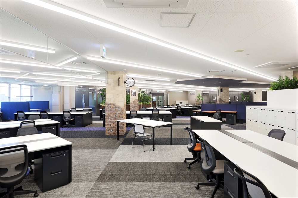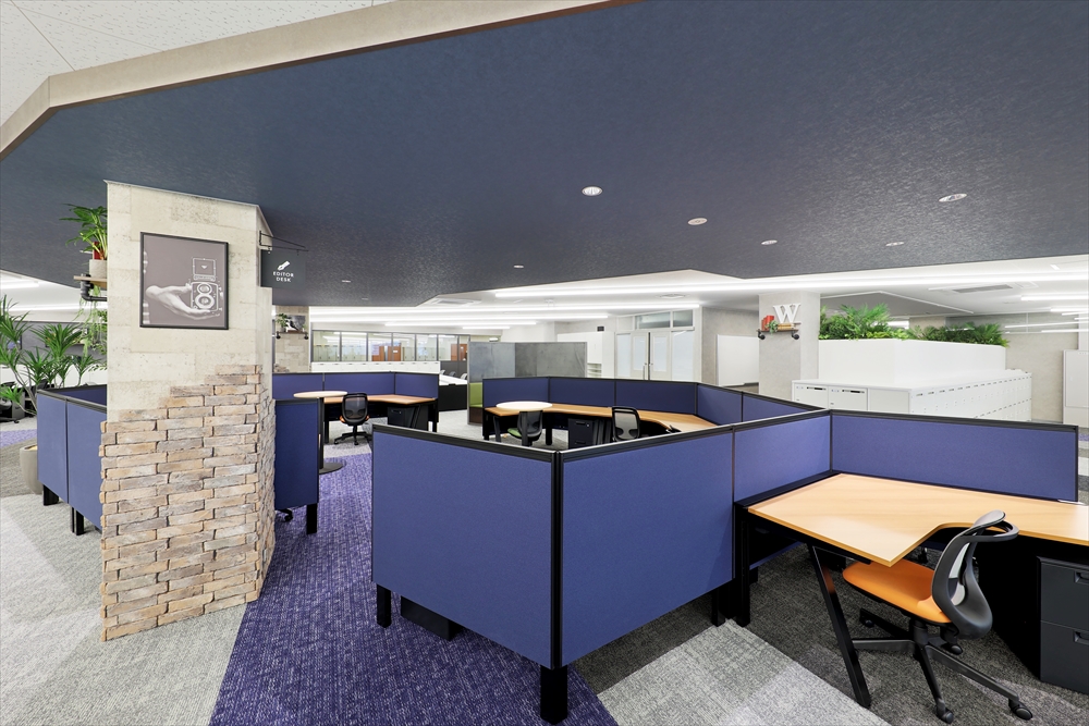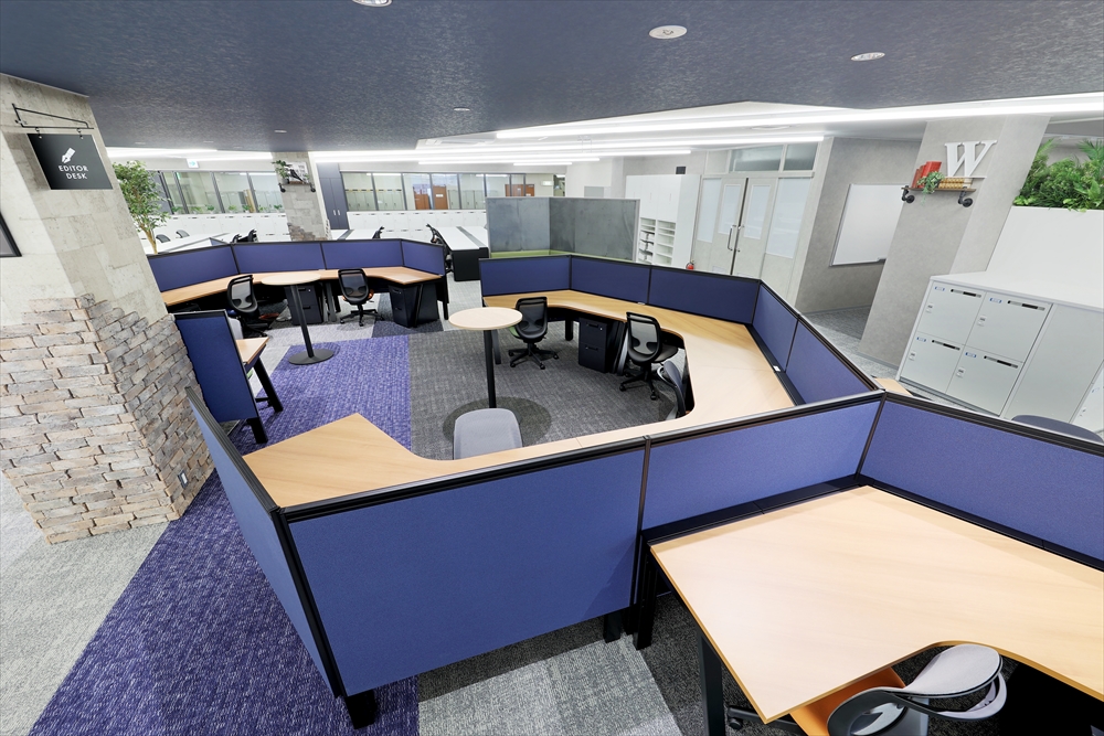 フリーレイアウトデスクを採用したどこでも仕事ができるオープンなスペースと、取材や会議などで利用するクローズドなスペースを設け、明るく快適な仕事場を作り出している。