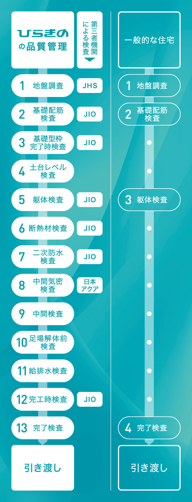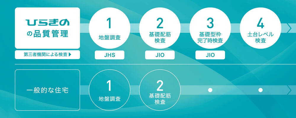 厳しいチェック体制を設けています - ひらぎのは、工事前から完成するまでの間、第三者機関を含めた厳正なる調査・検査を行い、お客様に安心安全な住宅を提供しています。一般的には瑕疵保険に加入できる分だけの検査を行えば建築可能です。ですが、ひらぎのは13項目のチェック体制を整えています。13項目のチェックを行うことで、性能を等級や数値で表す、住まいの性能をわかりやすく比較できる「設計住宅性能評価」において、4分野6項目の最高等級を取得しています。