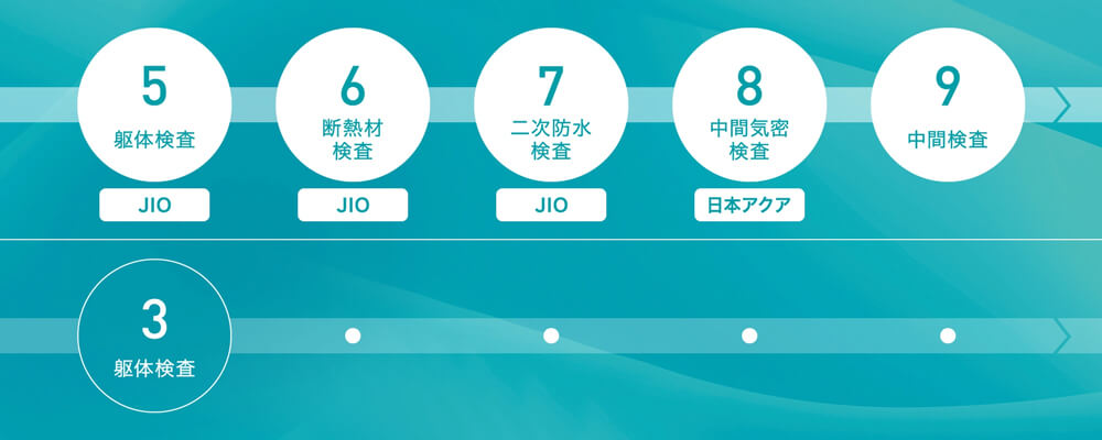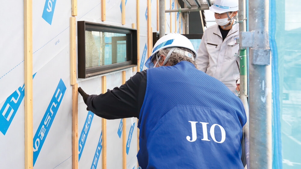 一次防水とは、外壁材や屋根材で常時表に出ているもの。二次防水とは、外壁材の下に施工される透湿防水シートや、屋根材の下に施工されるルーフィング。一次防水を施工すると見えなくなってしまう個所をチェックし、それから一次防水部分を施工します。シートなどのかかり方・重なり方や防水テープの施工状況確認を、JIOとともに行います。