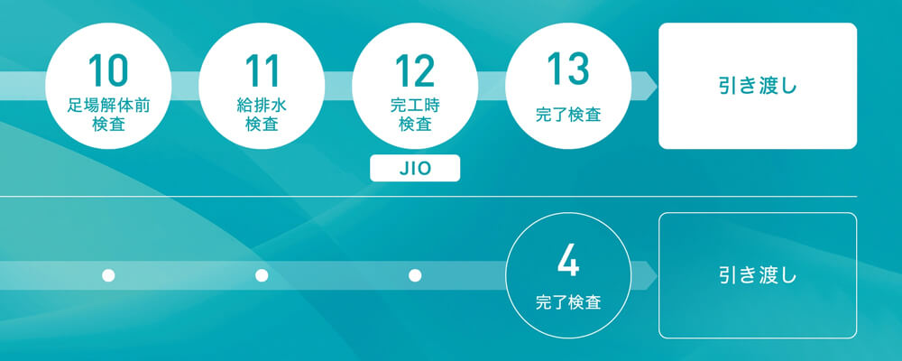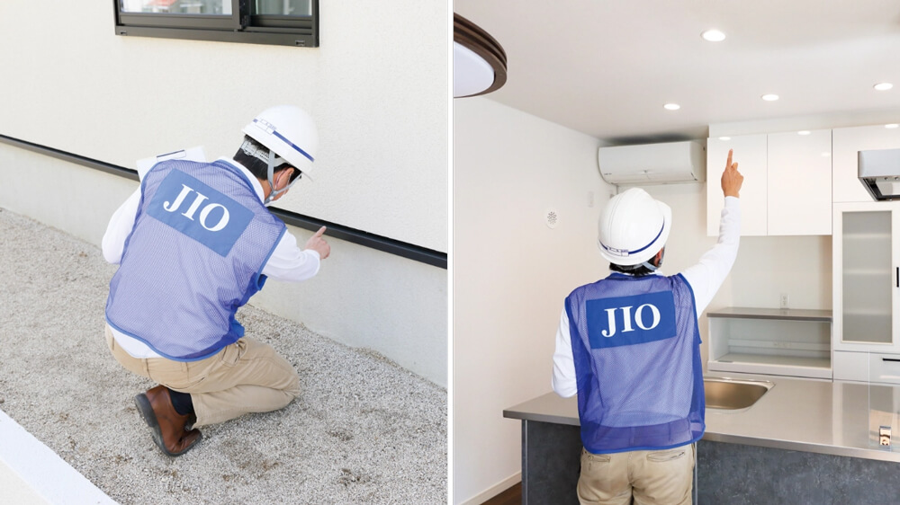 下記の完了検査とは別の検査で、JIO立ち合いのもとチェックを行います。予定通り仕上がっているか屋内外のチェックに加え、「設計住宅性能評価」に関わる予定通りの品番の製品がついているか、エネルギー性能が設計性能評価基準と同じかなどを確認します。