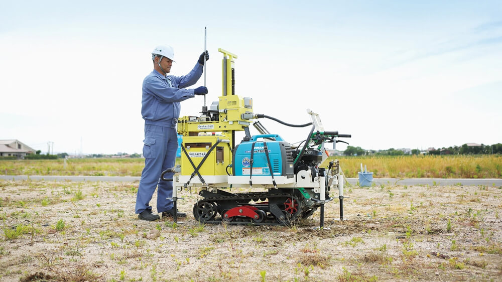 強固な住宅を建てても、その下の地盤が軟弱であれば対策を行わない住宅は不同沈下し傾いてしまいます。地盤の支持力はその土地によってさまざまで、目視では判断ができません。ジャパンホームシールド委託業者のもと、スクリューウエイト貫入試験を用いた地盤調査によって、土地の状態を的確に判断し、データに基づいて最善の地盤補強工事を行っております。