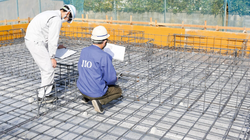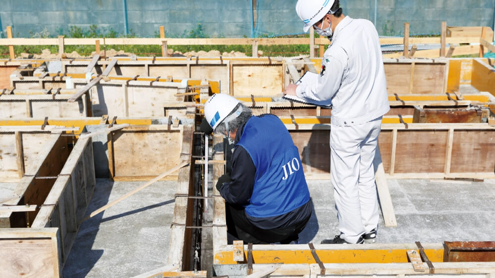 基礎は、建物を支える非常に重要な部位であり、大きな施工ミスがあれば住宅の安全性が脅かされる事になります。JIOとともに工事図面を見比べながら、防水シートの施工、鉄筋の太さや配置する間隔、継ぎ目部分の重なりの長さなど、細部に渡り確認します。この検査が通ると、コンクリートを流し込むための型枠施工を行います。
