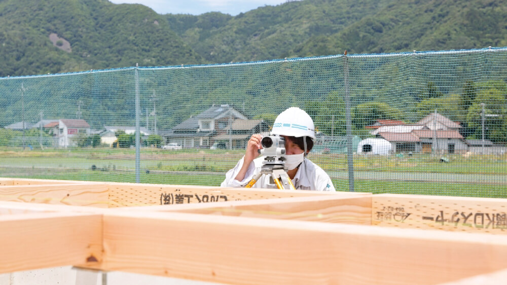基礎コンクリートの立ち上がり部分まで完成すると、型枠を外し、建築物の最下部の材木である土台を設置します。土台を設置後、レベルという測量機械を用い、高低差や水平具合やズレ等が無いかを、社内スタッフや施工大工とともにチェックします。レベル差が±1mm以下になるよう、チェック・調整後、良い日取りに上棟となります。