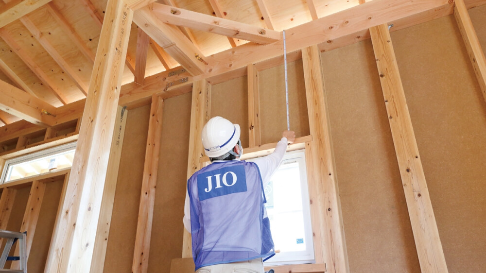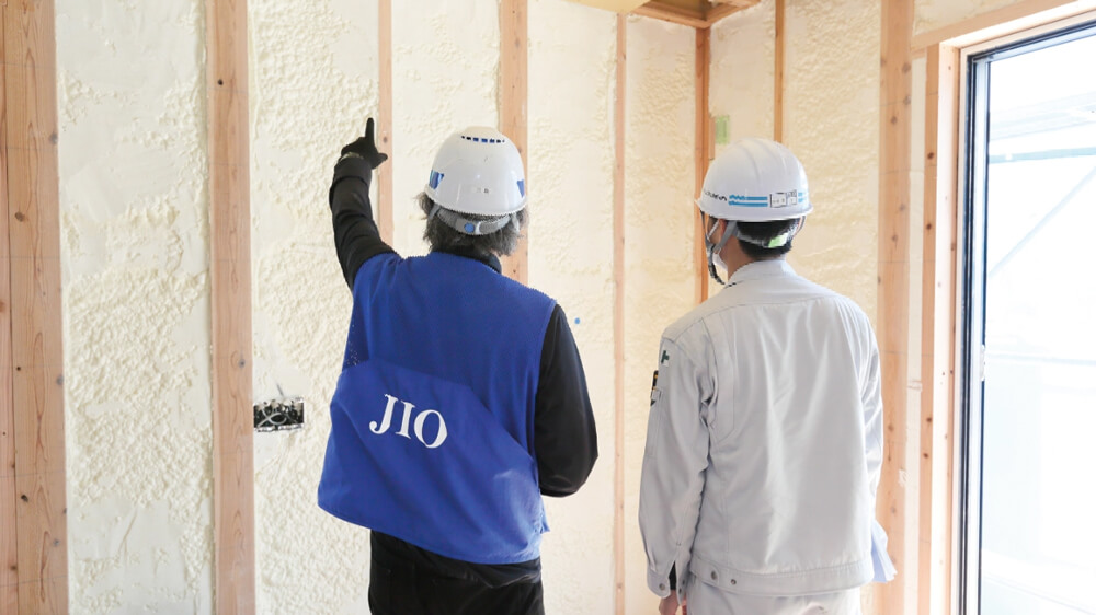 断熱施工が完了した後に、断熱性の確認を行います。設計図面通りに施工されているか、JIO立会いのもと、不備や不足が無いかなどをチェックします。ボードで覆われる前に、見えなくなる部分の確認を行います。断熱欠損の無い住宅に仕上げることができます。