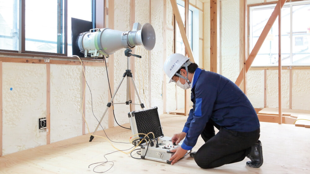 最新の住宅において、スキマは大敵です。スキマが大きいほど断熱性能の低い住宅になりますので、気密性を測定することは重要な意味を持ちます。床・壁・屋根へ、ボードやクロスが張られる前に、屋内で専用の測定機材を設置し、日本アクアが気密測定を行います。