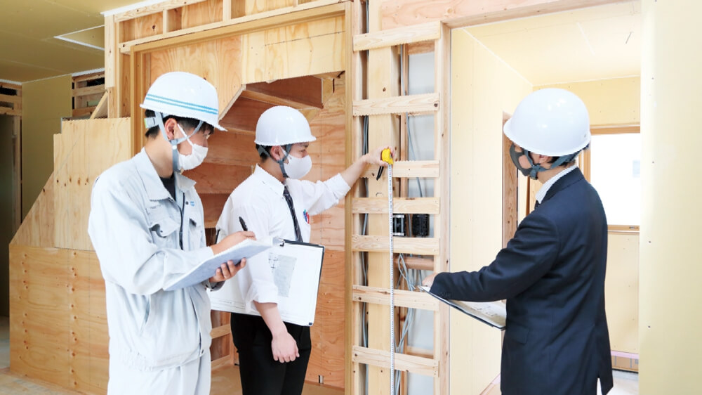 クロスなどの仕上げを行う前の、大工工事完了時に、ひらぎの設計と現場監督の工務が確認を行います。図面通り施工されているか、それぞれの高さや幅などに誤りが無いかなどを直接測りながらチェックします。問題がなければ、クロス張りなどの仕上げ作業に移ります。