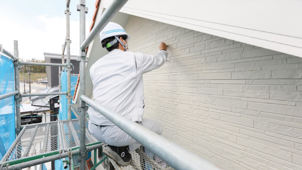 外回り工事が完了すると、足元あたりの整地や外構工事を行うために、住宅を囲んでいた足場を解体します。その解体前に、傷や汚れなど補修が必要そうな箇所のチェックを行います。高い所や近くでないとわかりにくい箇所は、足場がなくなると作業できないので、現場監督の工務が上から下まで確認します。
