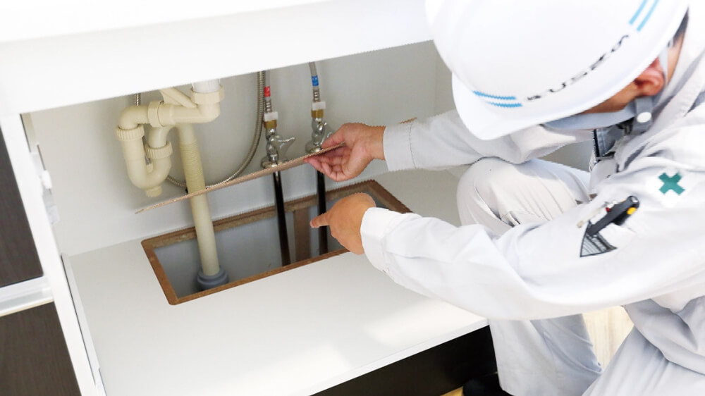 概ね完成してきたら、水道設備のあるキッチンや洗面台などで検査を行います。水道から水が出てくるか、排水が問題なく流れるかなど、配管部分を露出させて、現場監督の工務がチェックします。入居時に水が出ない、変な臭いがするなど無いように、徹底的に確認します。