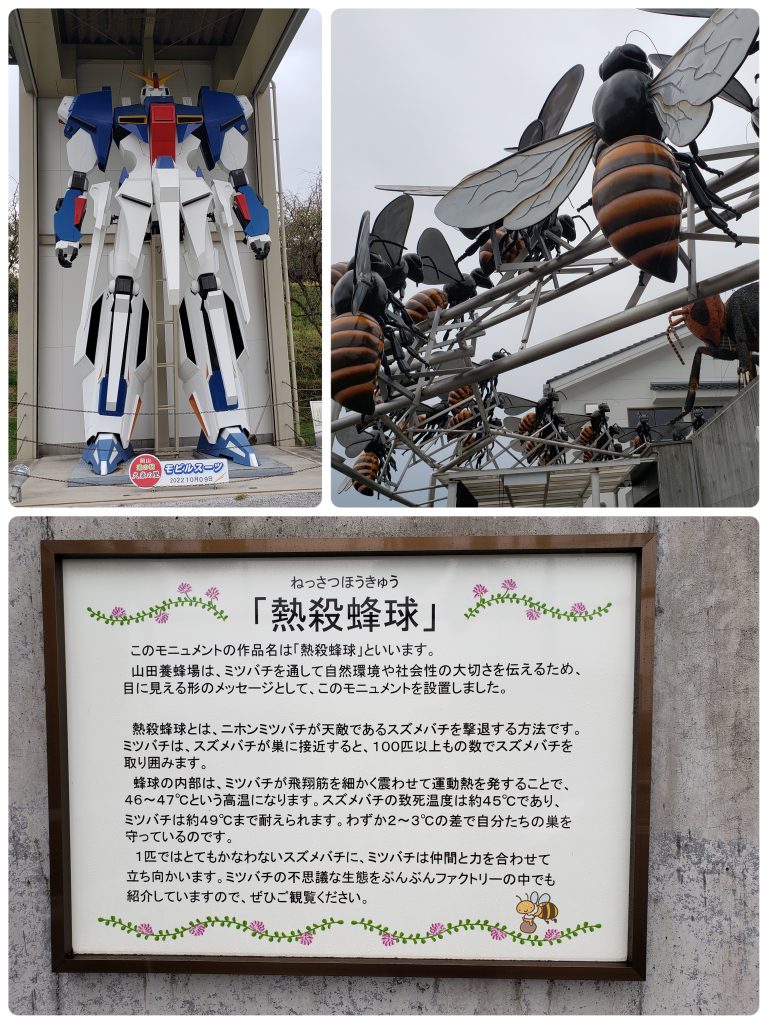 二つ目は大きな蜂です。養蜂場のお菓子工房「ぶんぶんファクトリー」の入り口に設置されており、「熱殺鋒球」というフォーメーションに仕立ててあります。