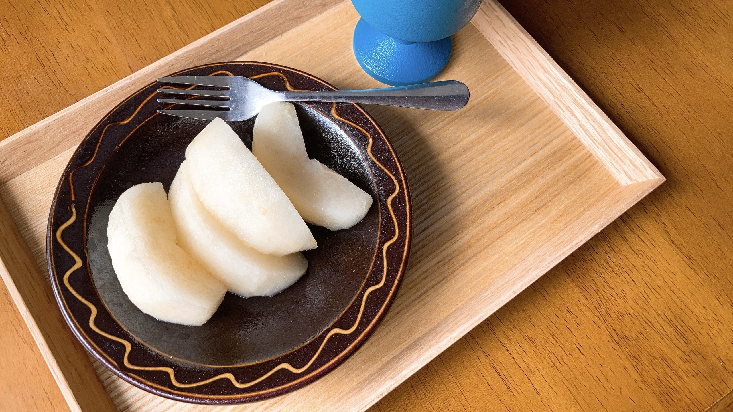 そんな中で、先日、実家から梨が届きました。私は果物の中で梨が一番好きなので、この季節が毎年楽しみなのですが、送られてきた梨の量がかなりのもので、腐らせる前に食べないと!と思い、朝昼晩、毎日梨を食べ続けていたら、気づいた時には残り1個になっていました(笑)