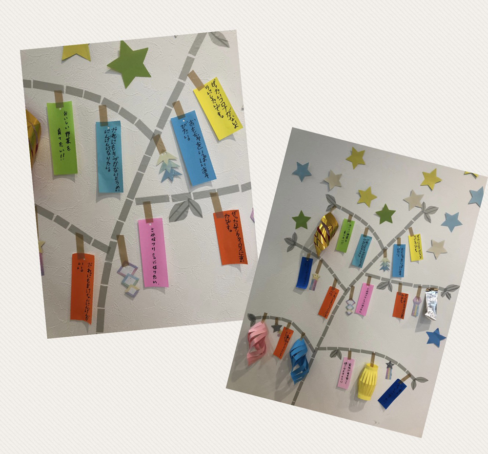 短冊には、「魚釣り屋さんになりたい」「誰にも負けない人間がいい」「サンタタロース⁈に会いたい」など1つだけではなく、何枚も思い思いの願い事を書いてくれました。