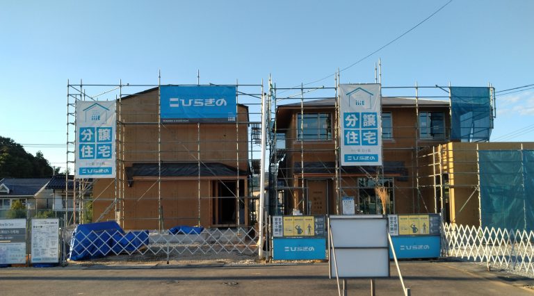 ひらぎのの分譲地グリーンテラス黒田では、分譲住宅が続々と着工しております。先日、1-4号地・1-5号地の棟上げが終わりました。